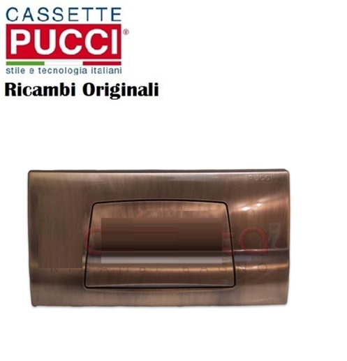 Placca Pucci per cassette ad incasso serie SARA a un pulsante stile Rettangolo in pvc e finitura Ramato Lucido. Correlata di telaio e viti di fissaggio. Misure Placca: 34 cm x 18 cm Finitura Ramato Lucido.